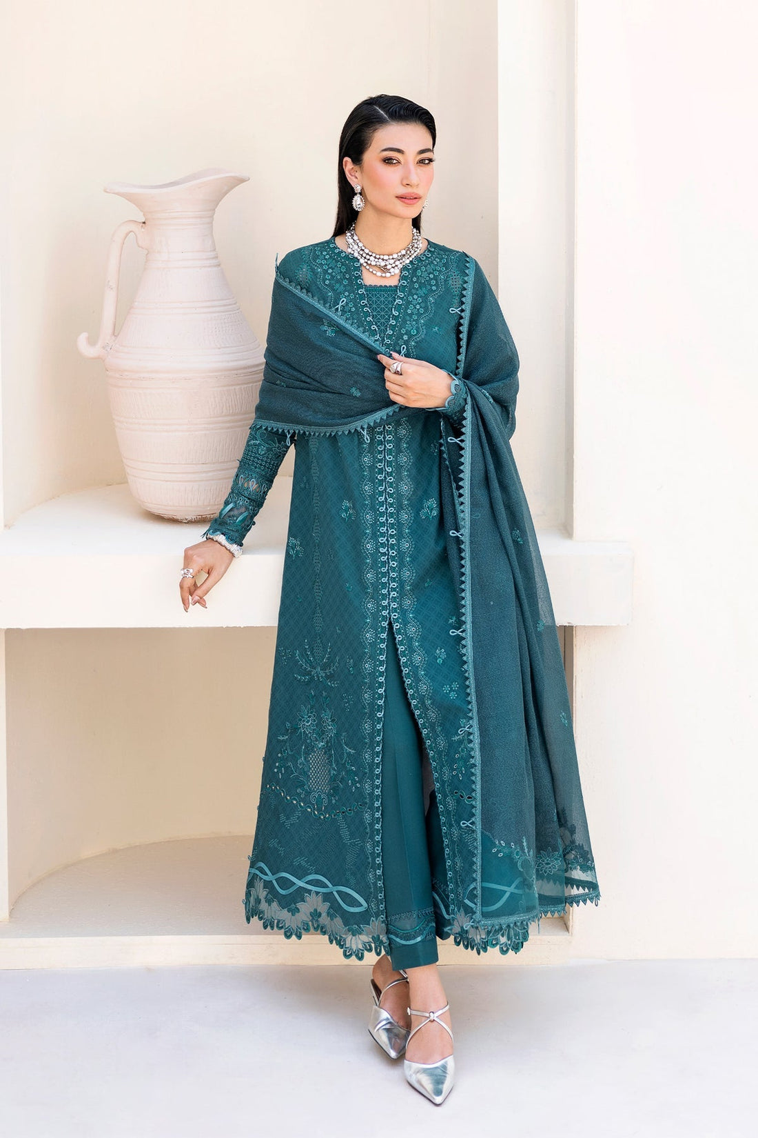 A study in regal poise, Rimaas showcases refined craftsmanship with every stitch. The pale olive...