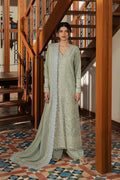 Description An exquisite long organza front-open olive green shirt, lavishly adorned with intricate zardozi handwork...