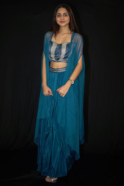 Teal Drape Skirt And Crop Top With Matching cape With Embroidered