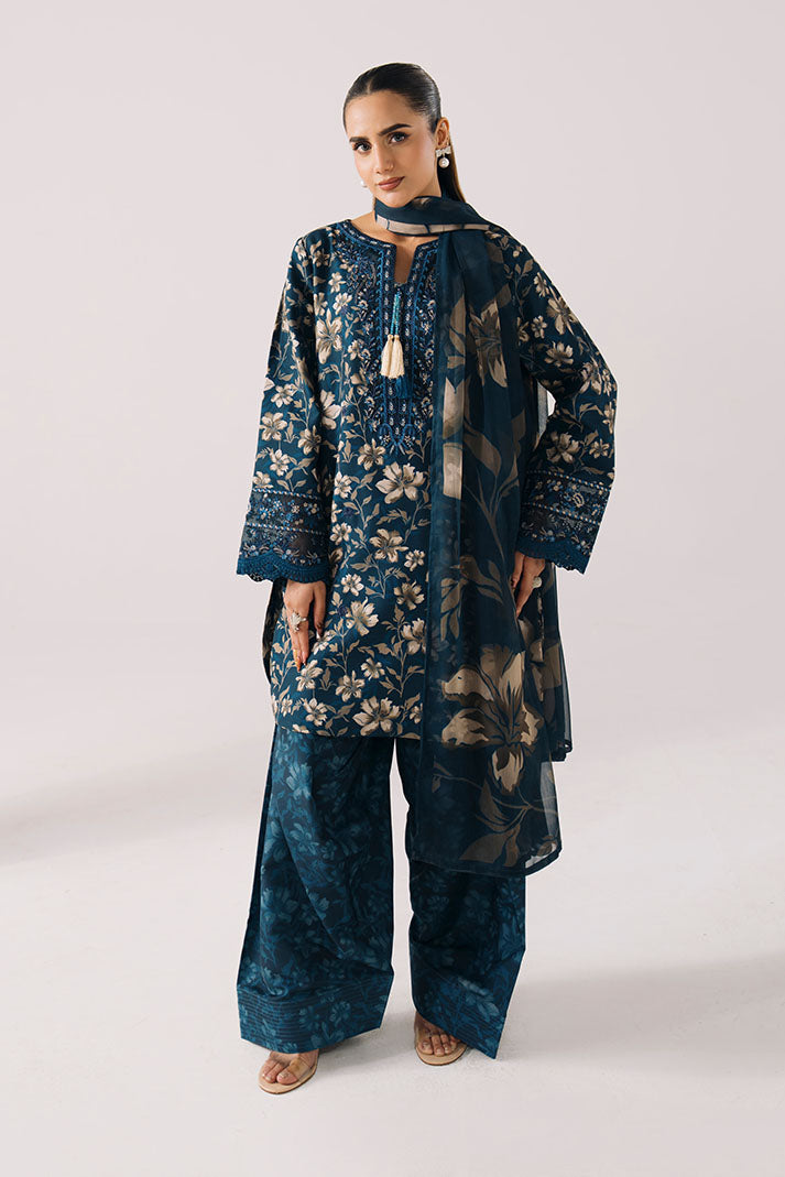 This striking teal blue embroidered lawn dress is elevated with bold crimson accents that enhance...