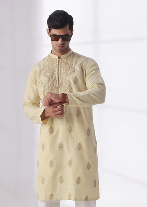 Men's Beige Jacquard Embroidered Kurta Pajama