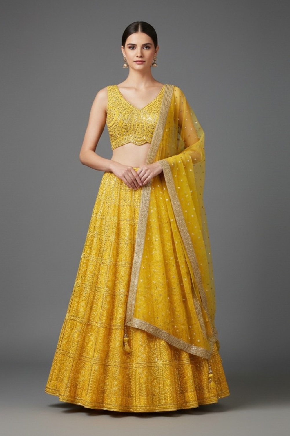 Radiate timeless elegance in this stunning mustard gold lehenga set, expertly crafted for those unforgettable...
