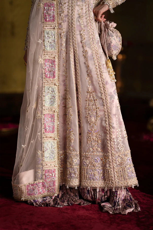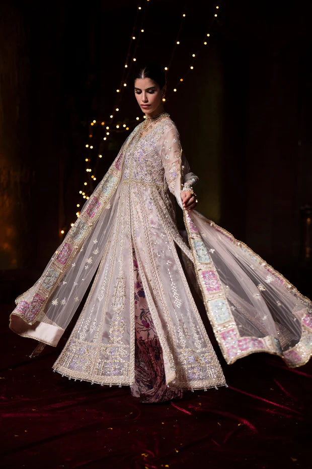 This Illic Pink Dress is a statement of elegance and uniqueness. Designed with a distinctive cut line, it features exquisite embroidery and delicate handwork. The look is elevated with a beautifully printed under-dress, paired with graceful sharara pants, and completed with a stunning dupatta that ties the whole ensemble together. A perfect blend of tradition and modern artistry