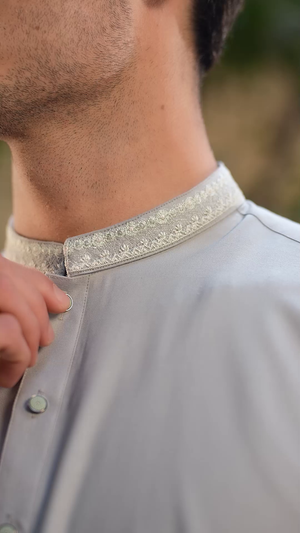 Buraq Men's Premium Ban-Embroidered Kameez Shalwar - Pale Dusty Green / Classic Fit.
