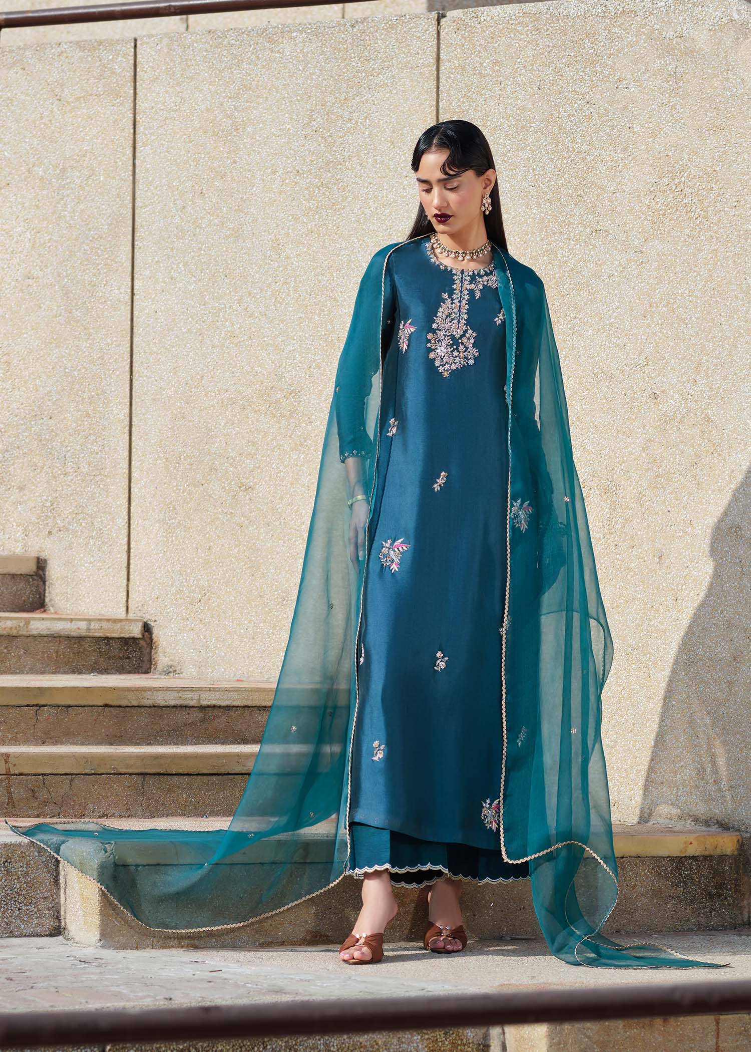 A deep emerald ensemble crafted for understated power. The embroidered shirt is paired with tailored culotte pants and finished with a sheer organza dupatta for a refined, elevated look.