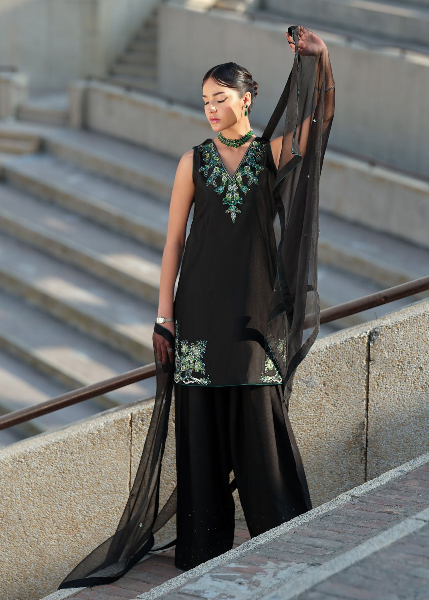 A bold black ensemble accented with emerald embroidery. The sharp silhouette is softened with a sheer organza dupatta, creating a powerful yet refined statement. The outfit comes with halter sleeveless , for a modest version you can choose sleeve. Each outfit is thoughtfully finished with a modest back neckline.