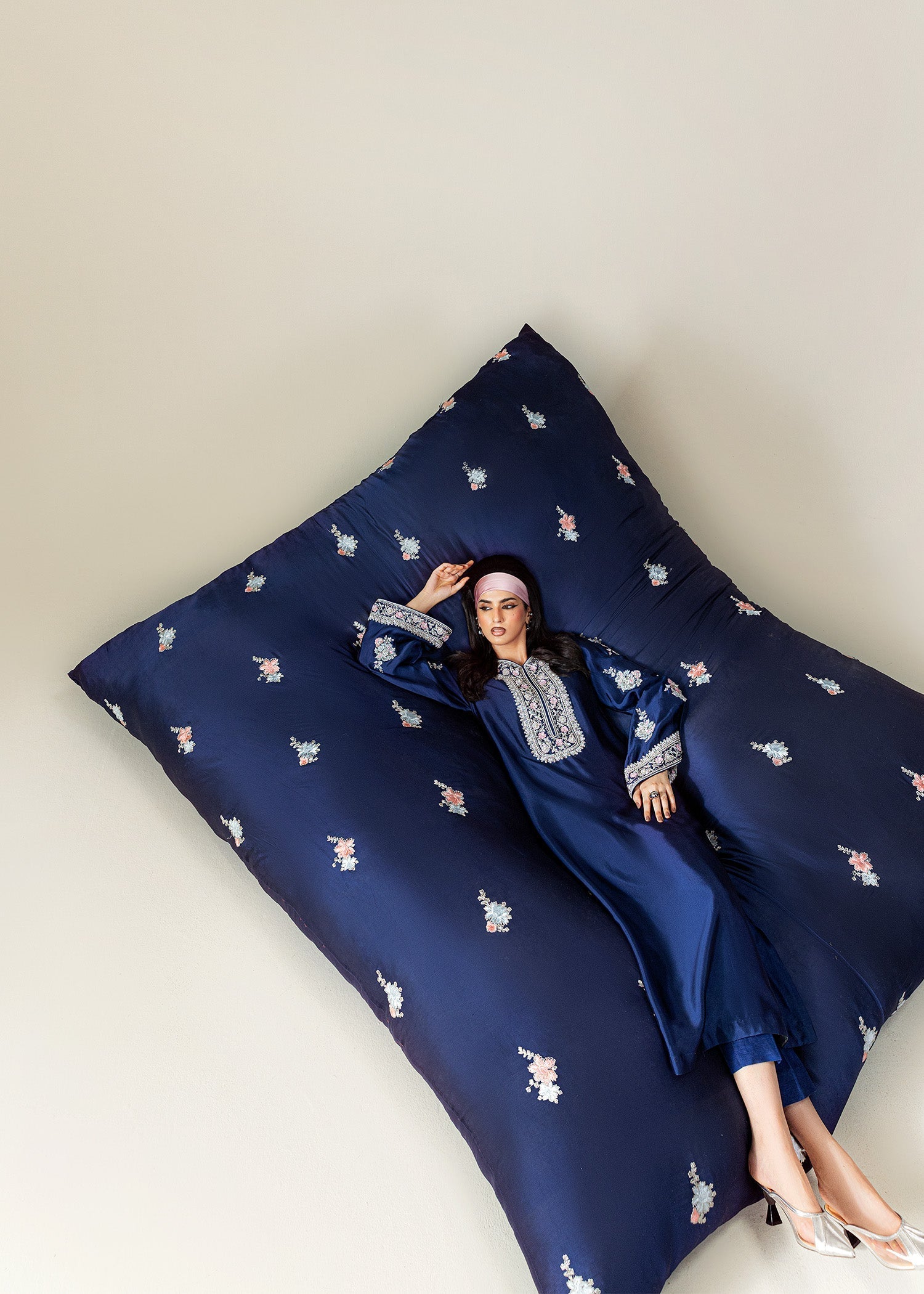 This elegant ensemble features a shirt crafted from pure tissue silk, adorned with intricate embroidery around the neckline and beautifully detailed floral bunches on the sleeves, adding a graceful touch. The trousers are made from luxurious raw silk, offering a rich texture and refined silhouette. The outfit is complemented by a delicate organza dupatta, which adds an airy and sophisticated finish to the look.