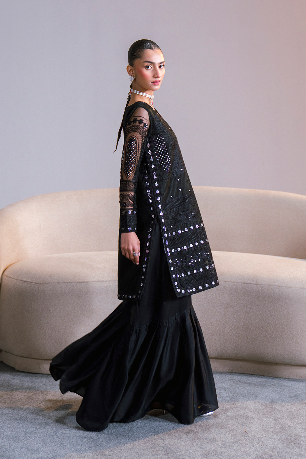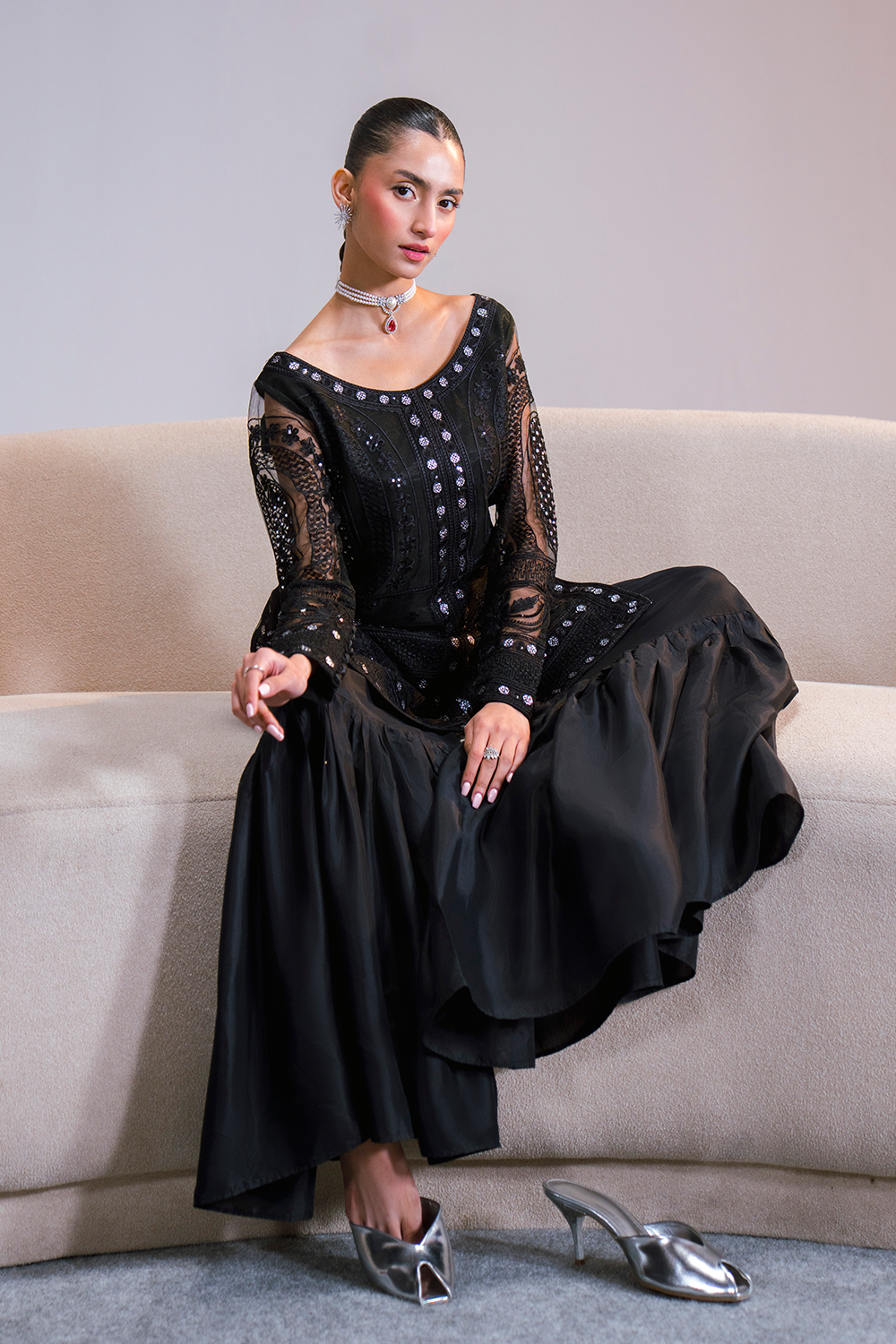 Exude timeless glamour with this Black 2-Piece Pret, featuring a delicately layered Bareeze net shirt paired with a sleek grip bottom. The mid-length, round-neck shirt is fully embroidered with shimmering sequin accents and finished with a soft lining for graceful structure. Fitted sleeves with ornate embroidered cuffs elevate the look, while the flared bottom with a gathered lower panel adds fluid movement. A striking blend of elegance and contemporary allure.