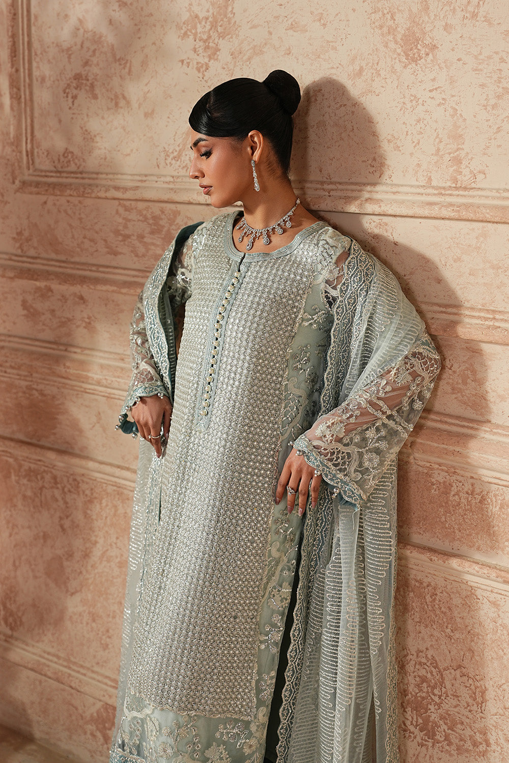 Drape yourself in elegance with this enchanting 3-piece pret in a serene Canal Blue hue. The Bareeze Net shirt features an embroidered round neckline with a delicate slit, adorned with loops and pearl accents, while an all-over embroidered jaal with subtle panni detailing adds luminous charm. A wide embroidered hem with scalloped borders and pearl finishes, along with fully embroidered flared sleeves, creates a statement silhouette. Paired with a sleek straight Grip trouser and a Bareeze Net dupatta framed with four-sided scalloped embroidery, this ensemble is pure sophistication redefined.