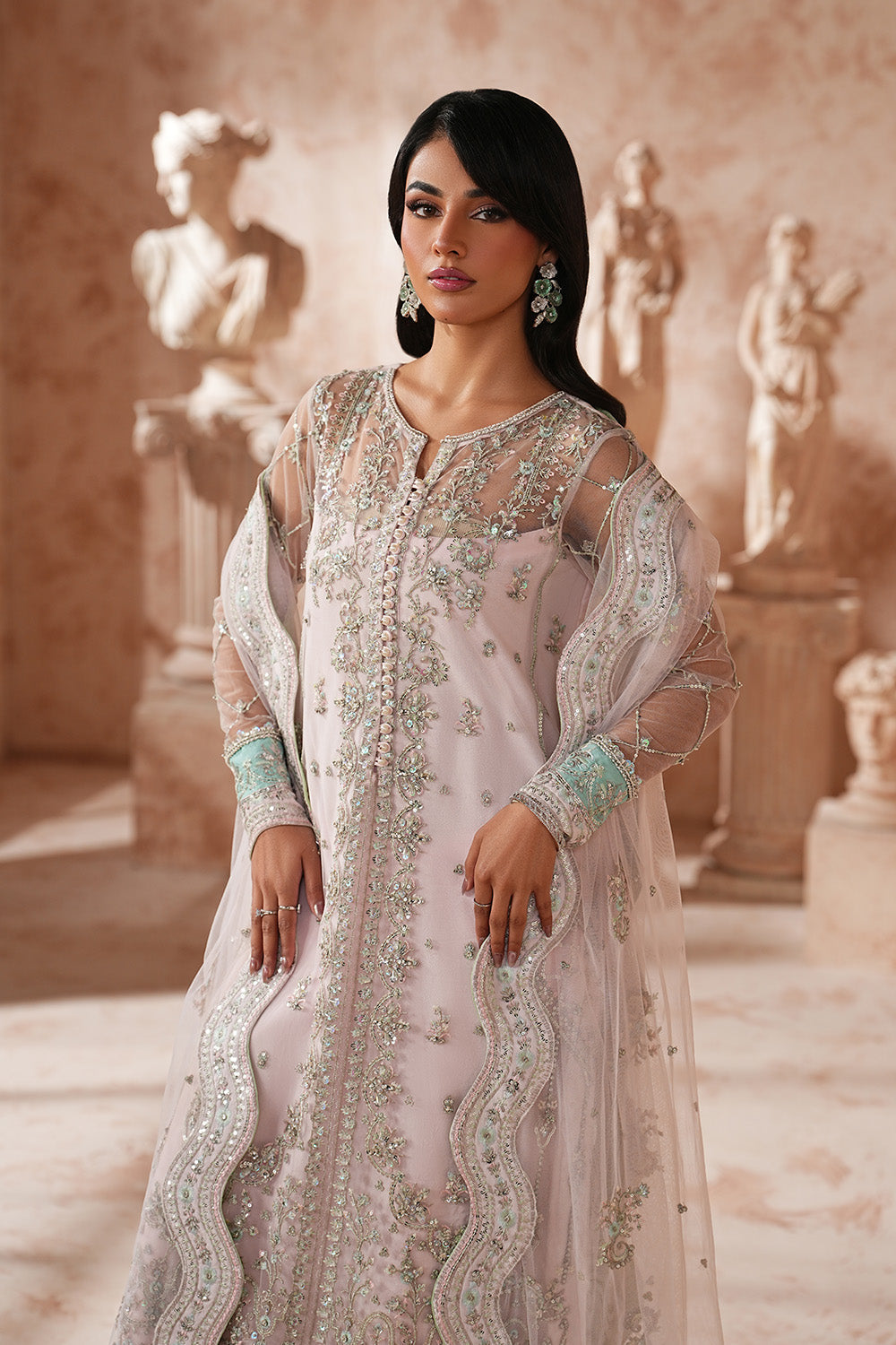 Radiate effortless charm in this captivating 3-piece pret in a refreshing Mango Calcite hue. The Bareeze Net shirt features a round neck with a chic slit opening, accented by center loops and embroidered button detailing, while intricate all-over embroidery with delicate adda work enhances its elegance. Fitted embroidered sleeves and contrast borders on the hem add refined definition, perfectly paired with a flared Grip trouser finished with embroidered edging. The look is completed with a dreamy Bareeze Net dupatta, adorned with an all-over embroidery spray and four-sided scalloped borders for a truly graceful finish.