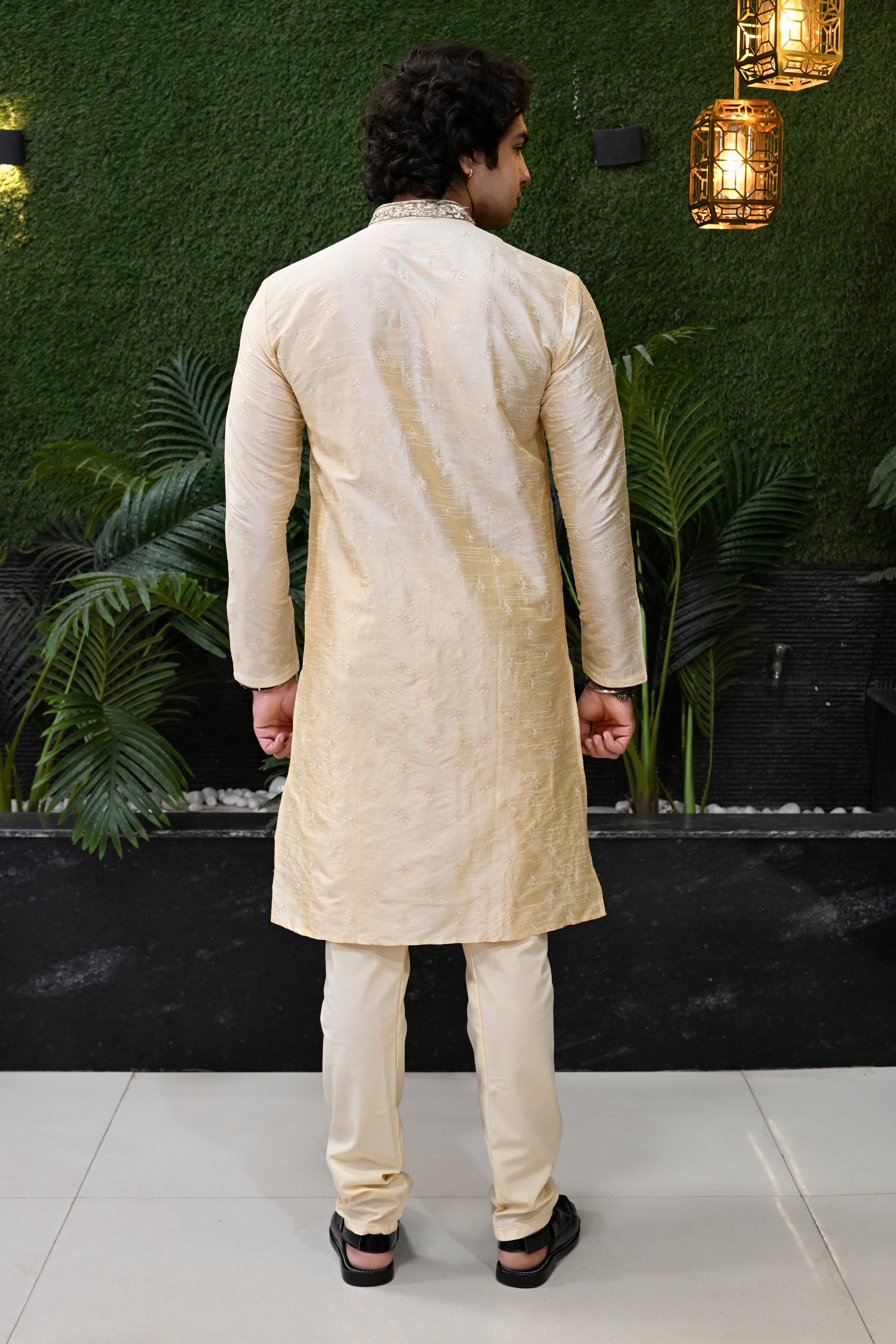 Men's Cream Beige Weaved Thread Embroidered Kurta Pajama