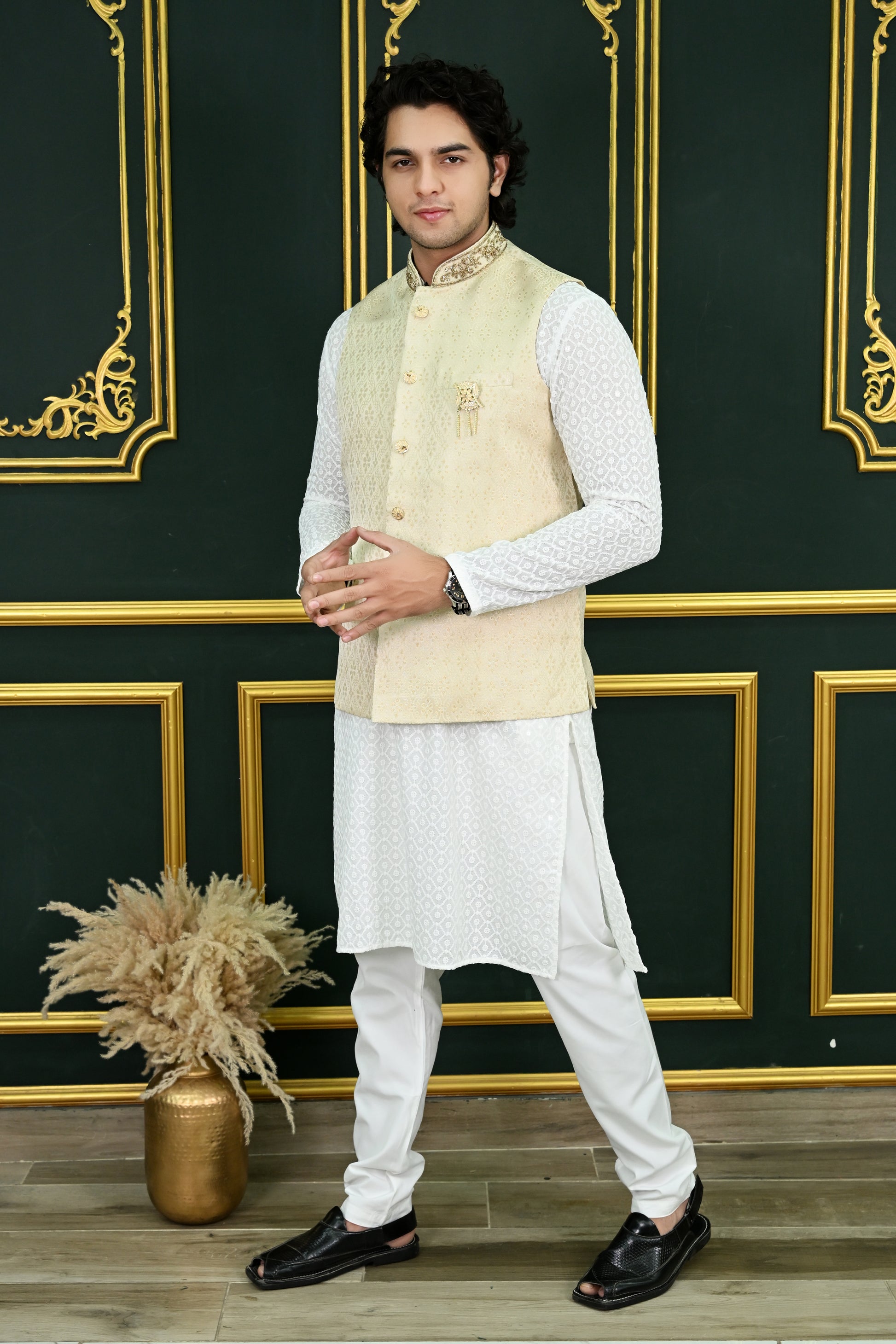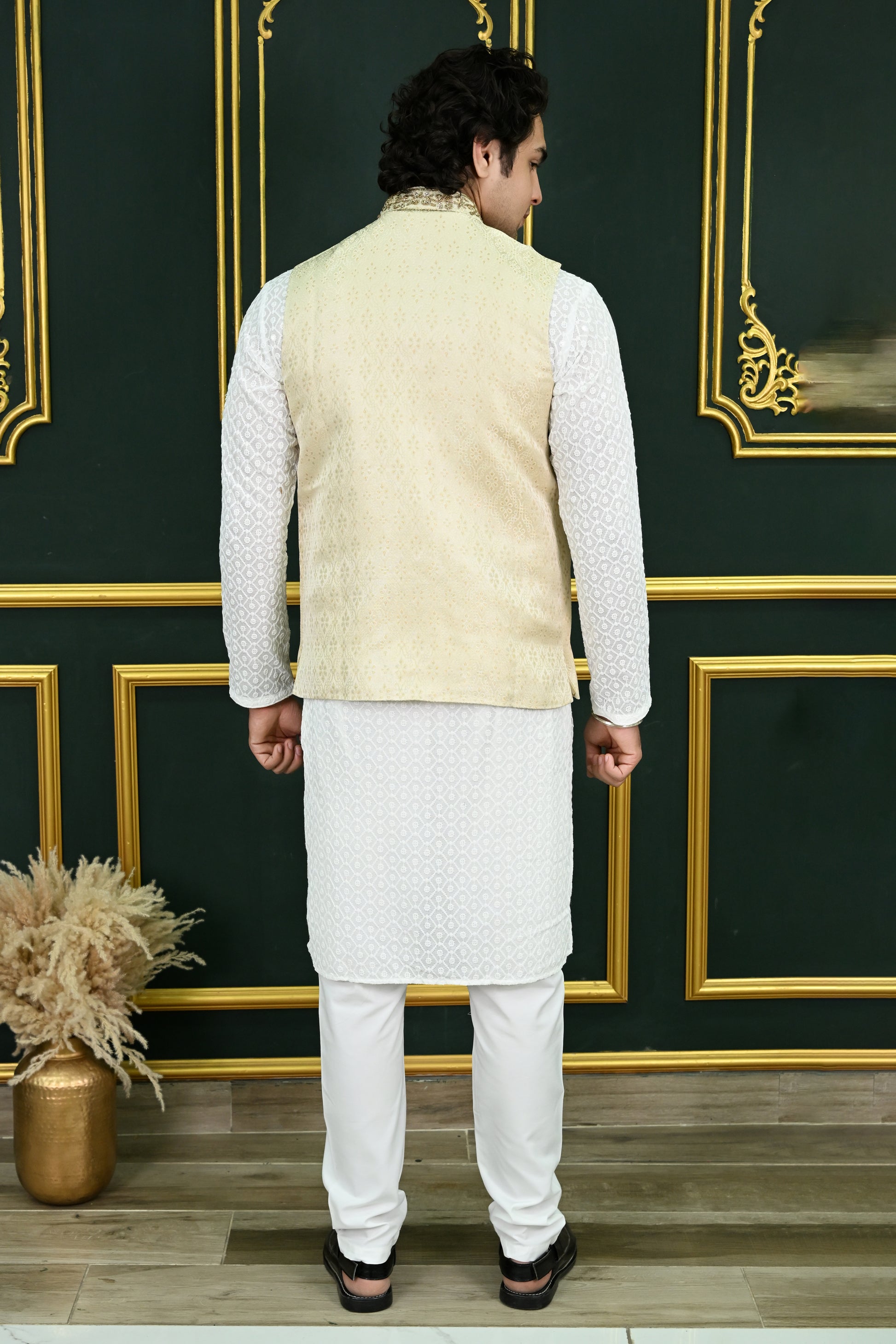 Add a touch of refined elegance to your wardrobe with the Men's Off White Dupion Waistcoat. Crafted from premium Dupion fabric, this waistcoat features a luxurious texture and a subtle sheen, making it the perfect choice for both formal and festive occasions. The soft off-white hue offers a versatile and timeless look, effortlessly complementing a variety of outfits, from traditional kurta sets to Western suits.