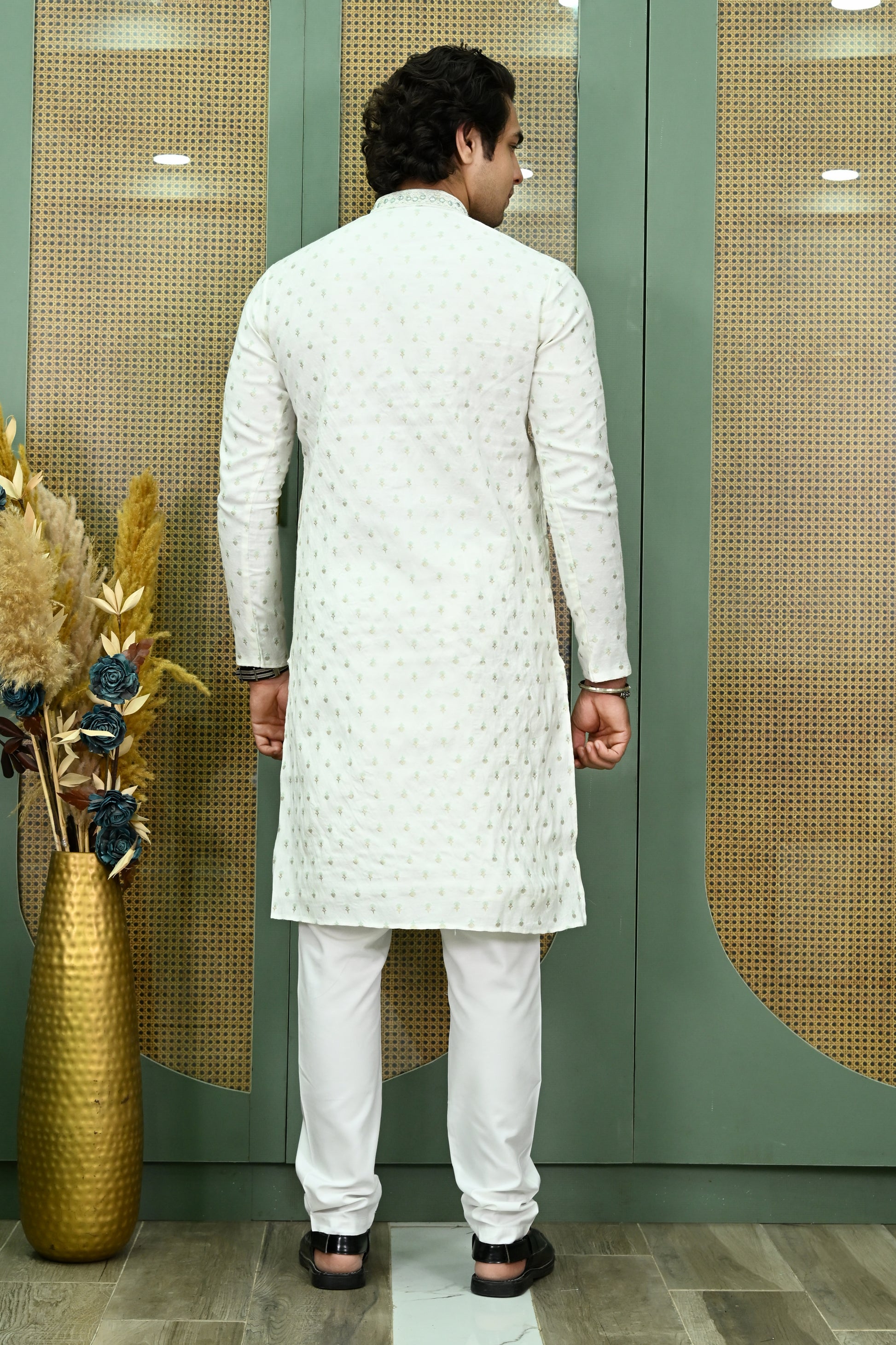 Perfect for grand events, religious gatherings, or formal festivities, this embroidered kurta pajama is a wardrobe essential for the modern man. Style it with traditional footwear like mojris or juttis and accessorize with a stole or a statement watch for a distinguished look. Whether you're the groom, a wedding guest, or attending a cultural affair, this outfit promises to make you stand out with effortless grace.