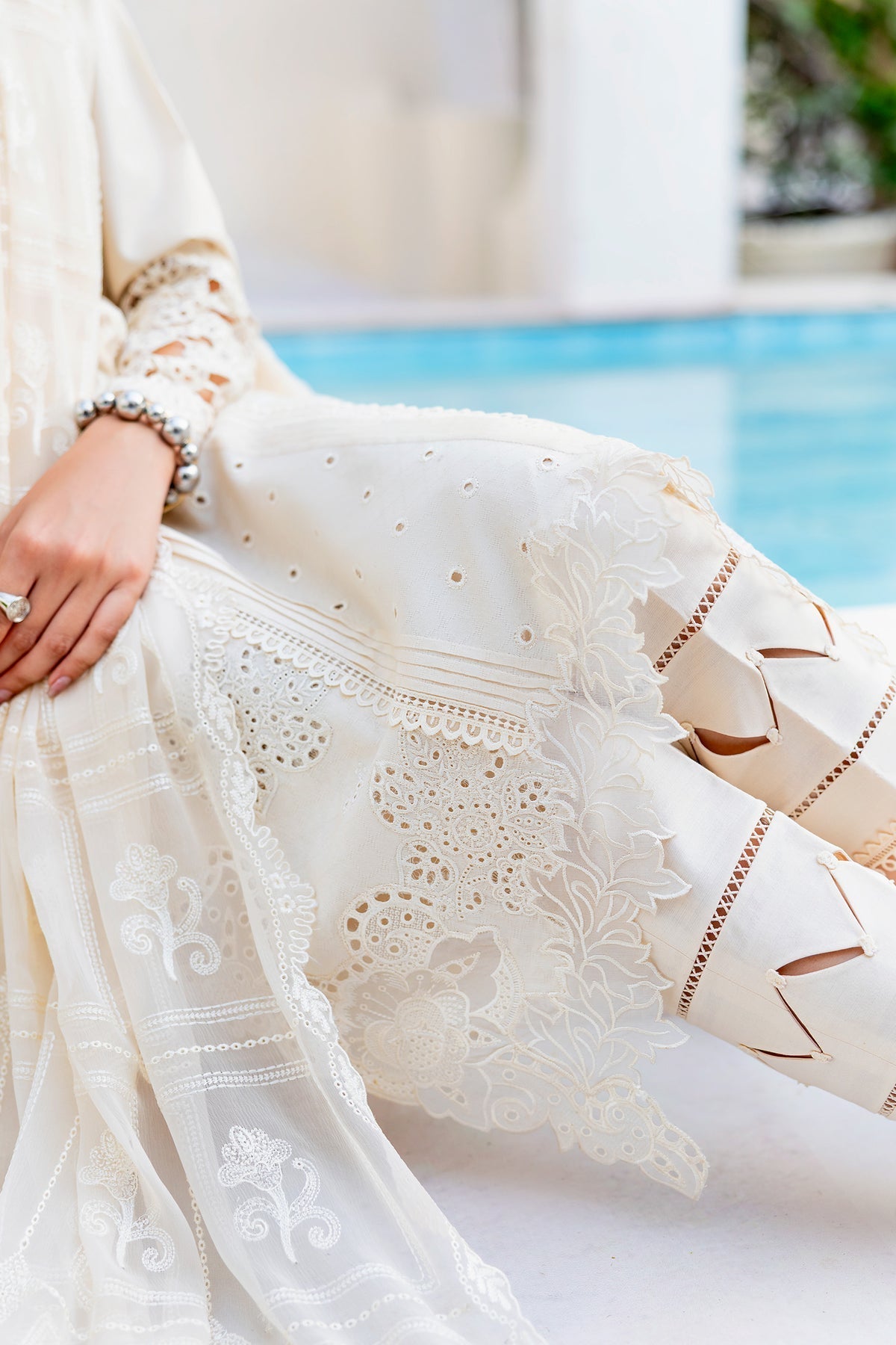 Halo features a jacquard weaved shirt paired with a flowing chiffon dupatta and cotton trousers, brought together in serene ivory tones for graceful everyday elegance.