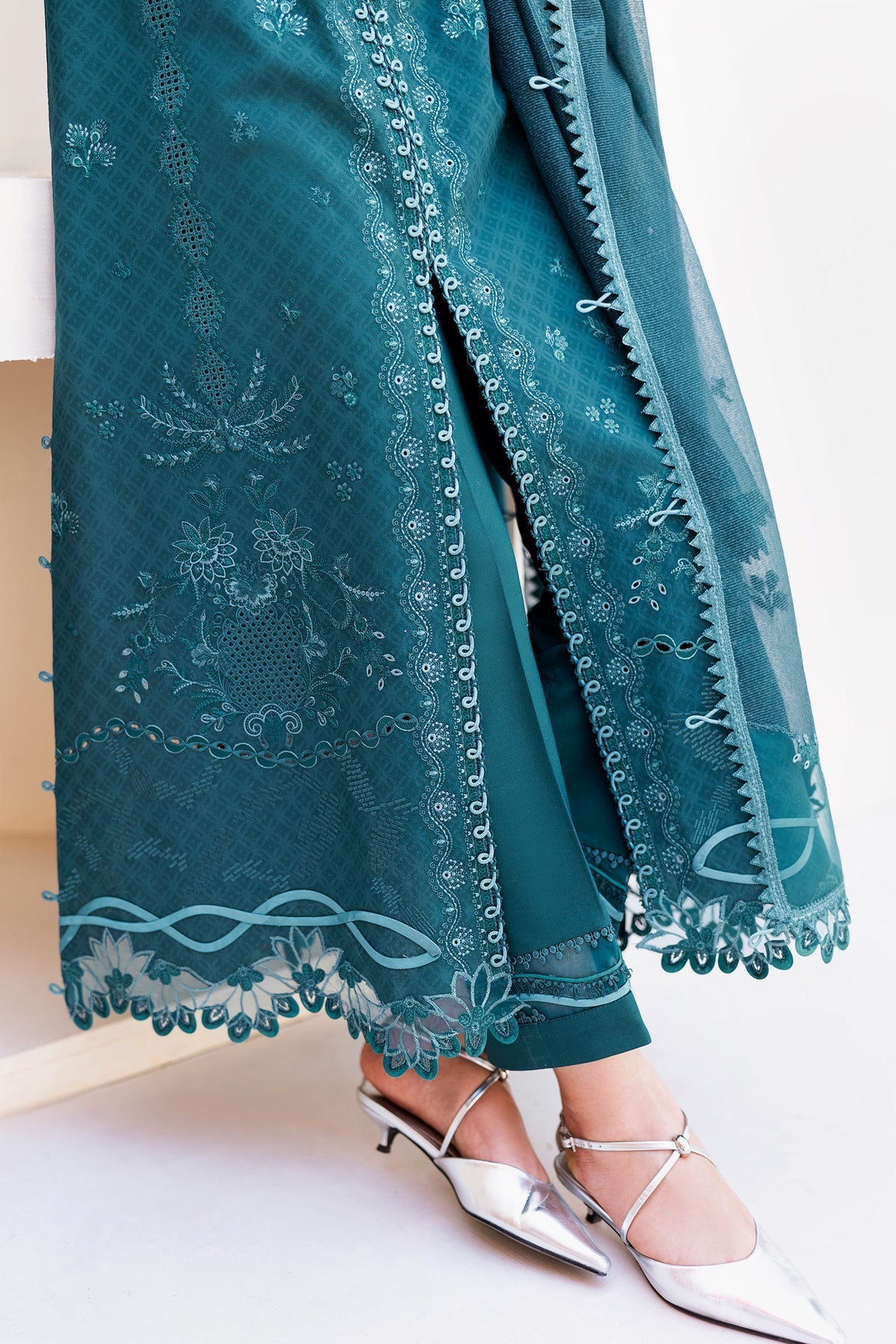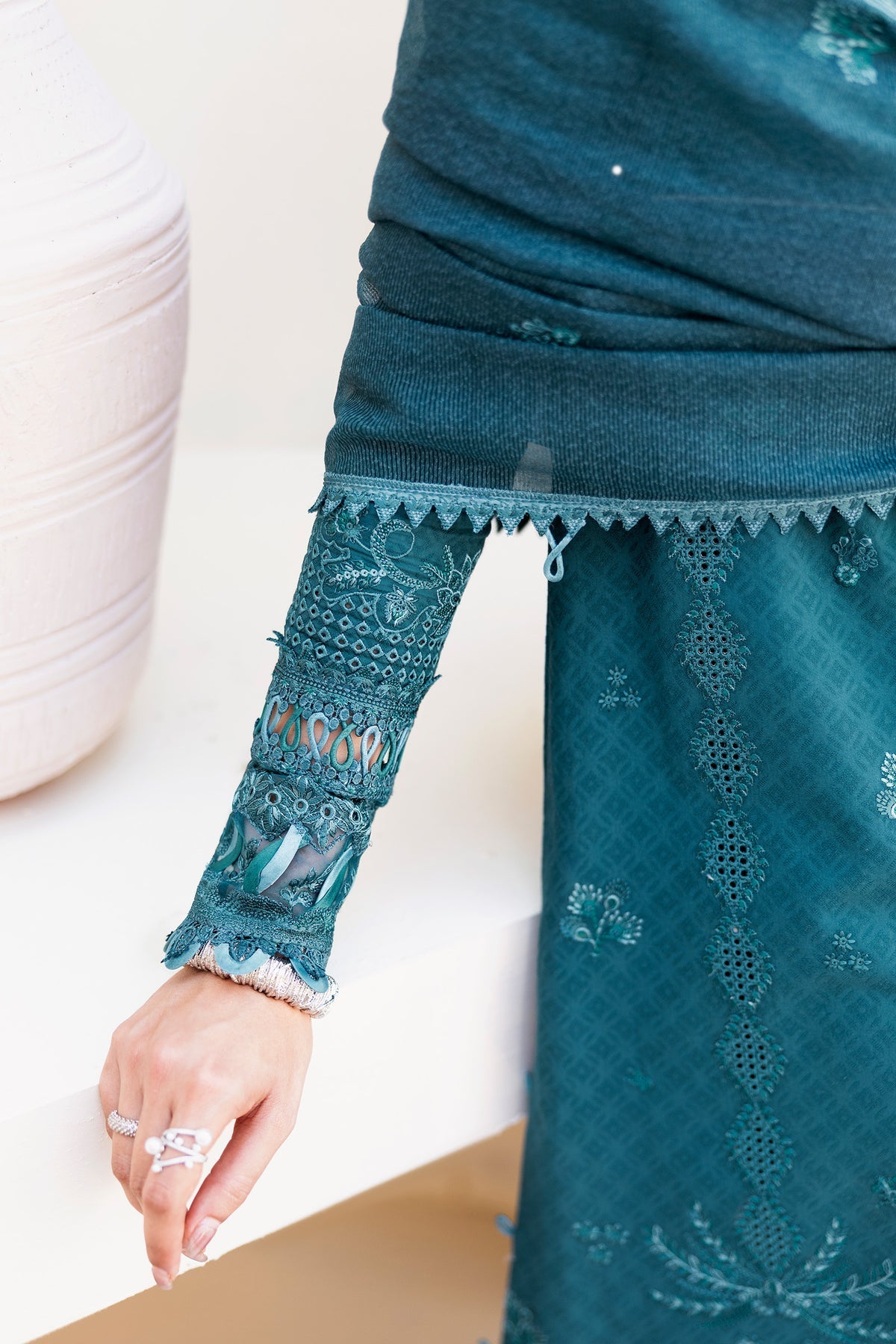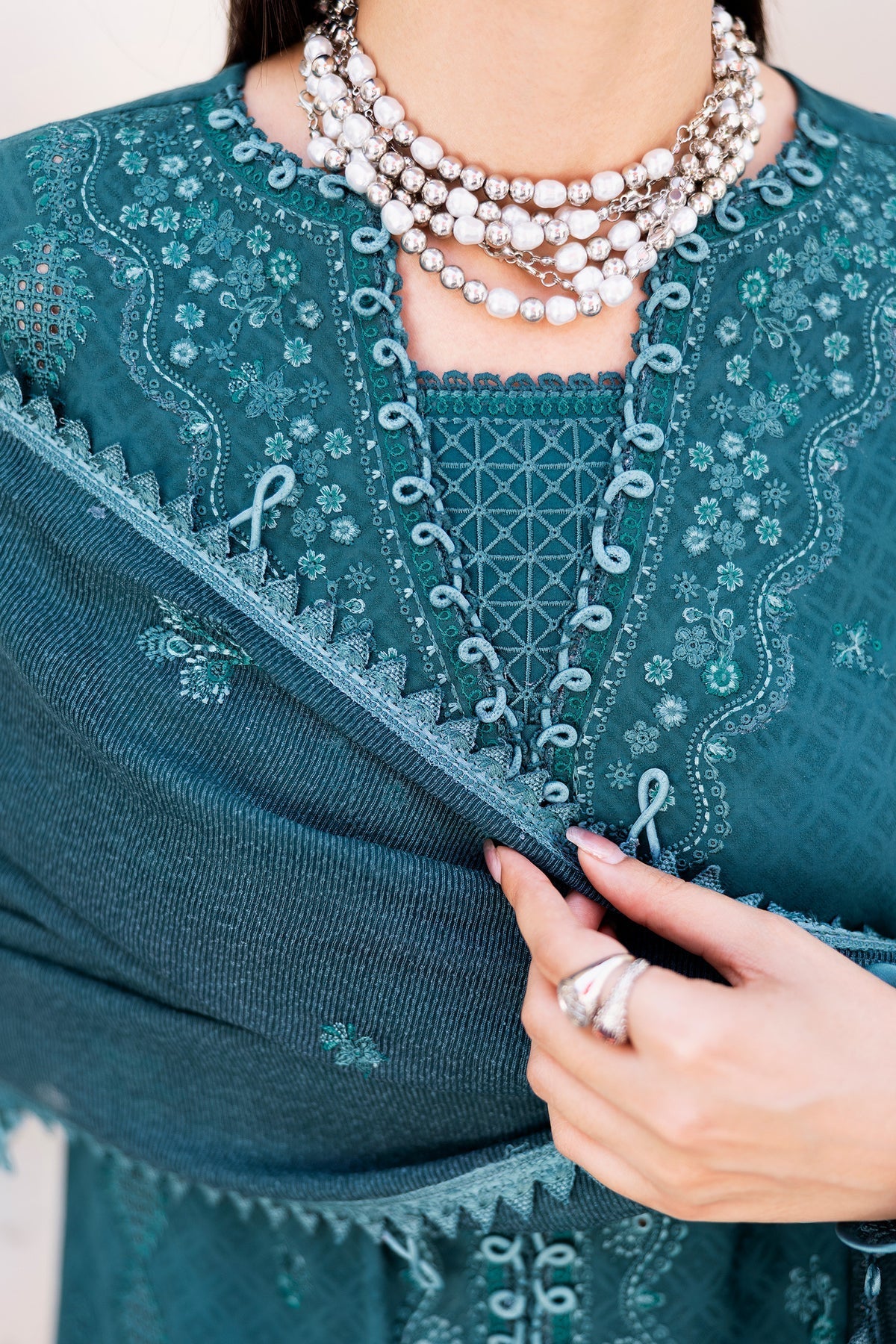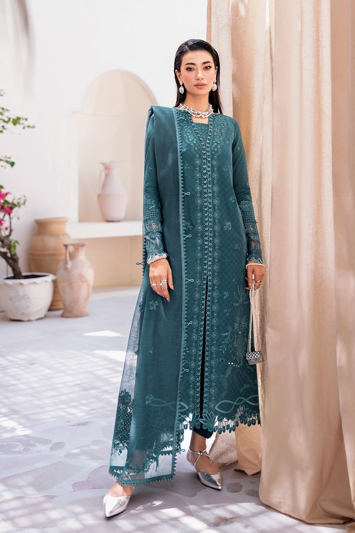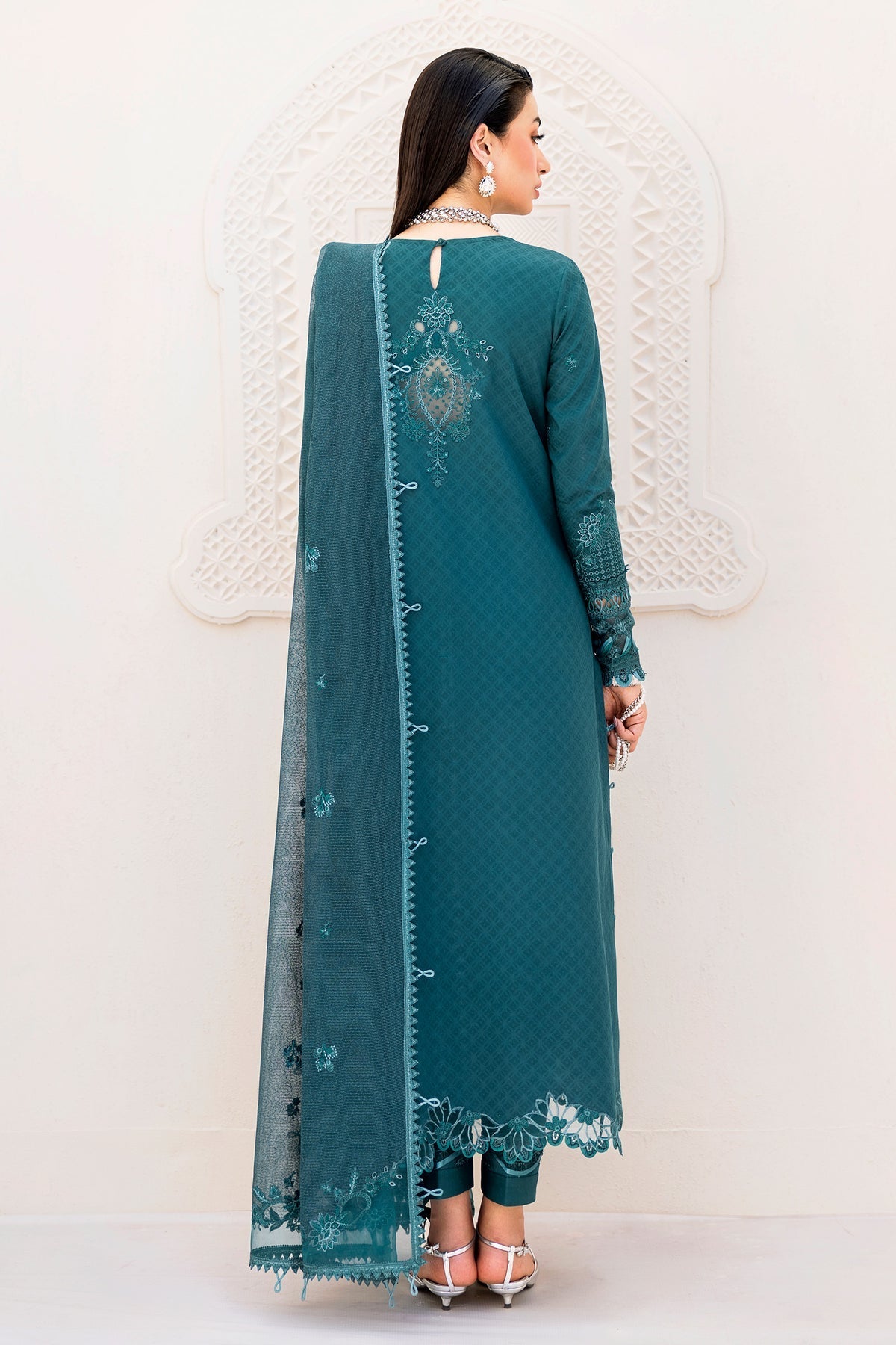 Harbor presents a jacquard weaved shirt enriched with intricate detailing, styled with a jacquard dupatta and cotton trousers in deep, composed hues.