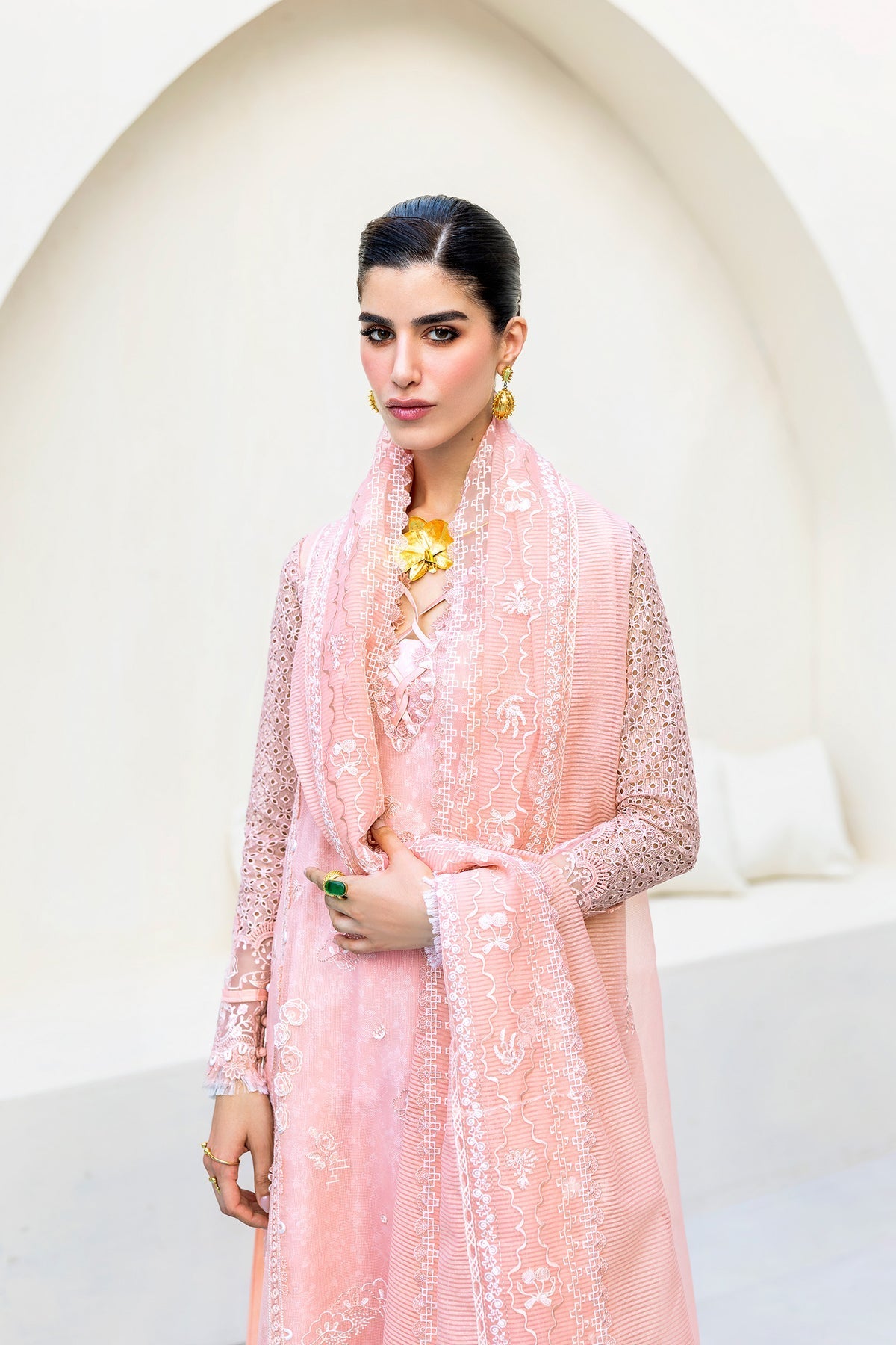 Bloom pairs a rocket net shirt with a lawn printed slip, finished with a jacquard weaved dupatta and cotton trousers for a delicate yet polished look.