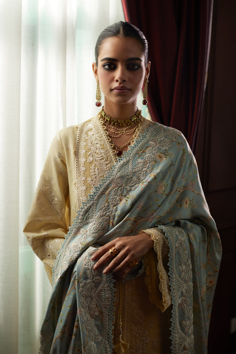 Introducing a charming butter yellow front-open shirt with beautiful off-white all-over embroidery. It comes with a silk contrast dupatta in ice blue, beautifully printed and embroidered, adding elegance to this stylish ensemble. Perfect for any special occasion.