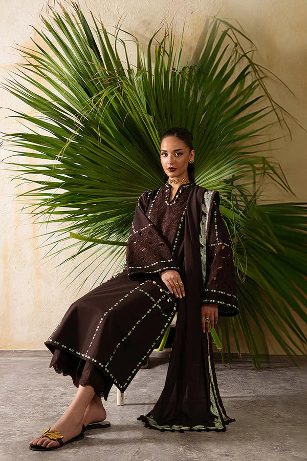 Overlapped jacquard shirt in chocolate brown with kurta hem, crew with V neckline, and box sleeves detailed with cutwork and fringed lace.